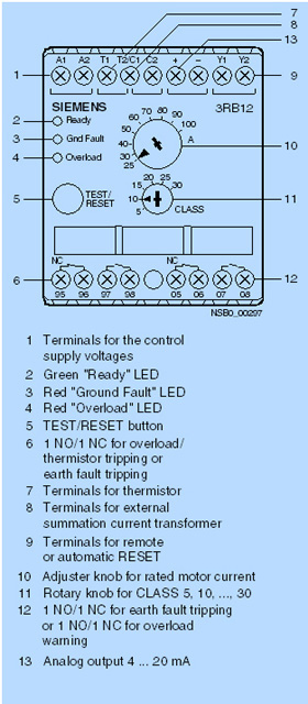 Электронные реле перегрузки 3RB12 для полной защиты двигателя с винтовыми зажимами для встраивания1) и отдельной установки, CLASS 5 -- CLASS 30 регулируемые