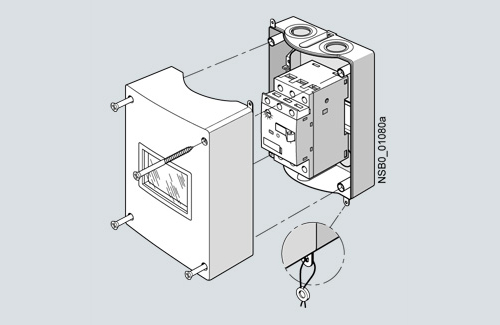 При силовом автоматическом выключателе типоразмера SOO управление осуществляется через мембрану корпуса. На мембрану может быть надета крышка, которая может быть закрыта на 3 замка для предотвращения включения силового автоматического выключателя, например, при работах по обслуживанию.