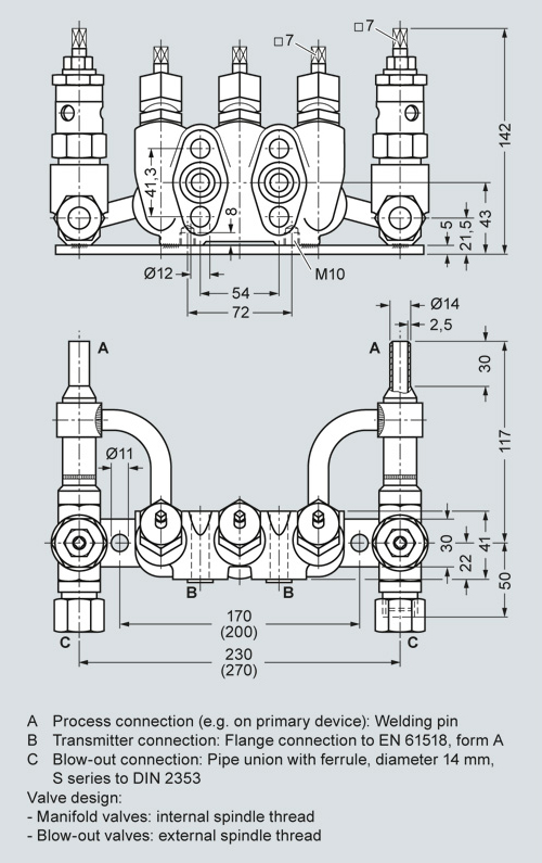Комбинация вентильных блоков DN 5/DN 8 (7MF9416-6C.), размеры в мм (измененные размеры для 7MF9416-6D. в скобках)