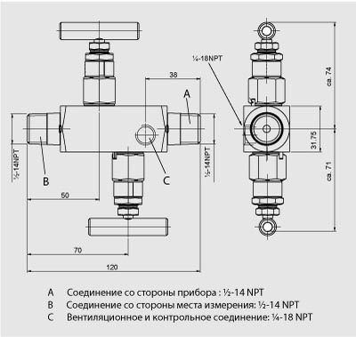 Двойной запорный вентиль DN 5 (муфта-цапфа), размеры в мм