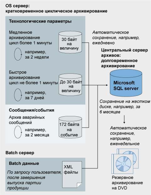 Система архивирования OS станций SIMATIC PCS7 базируется на использовании Microsoft SQL Server с циклическим архивированием значений технологических параметров, оперативных и аварийных сообщений для их кратковременного хранения. Эти данные вместе с формируемыми отчетами, а также данными SIMATIC BATCH систем могут экспортироваться в StoragePlus или центральный сервер архивов (CAS –Central Archive Server) для создания долговременных архивов.