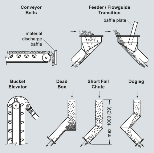 Характеристики расходомера зависят от равномерности потока материала проходящего через него. Ниже приводятся типичные способы обеспечения равномерности потока в зависимости от подающих устройств. Для каждого подающего устройства используется определенный способ. Для достижения оптимальных результатов можно заказать проверку приложения экспертам Siemens по расходомерам сыпучих веществ. При пуске расходомера в эксплуатацию проводятся тесты с материалом. При этом взвешиваются пробы материала до или после подачи через расходомер, затем материал пропускается через расходомер и по результатам осуществляется калибровка и проверяется точность.