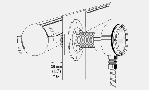 The WM100 probe should be mounted, using the supplied mounting flange, onto a vibration-free structure. The gap between the probe and the target should be sufficient such that there is no danger of the target damaging the probe. The maximum allowable gap is 100 mm (4") from the face of the target to the face of the probe for 4.5 x 4.5 mm (3/16 x 3/16") keyway. The WM100 is sensitive to lateral disturbances to its magnetic field. If the WM100 is responding to motion from an interfering target, move the WM100 or install a ferrous plate (steel) as a shield between the WM100 and the interfering target. Where possible, the probe should be mounted such that the cable inlet is pointing downward to avoid accumulation of condensation in the casing. Connection of the probe should be made via flexible conduit for easier removal or adjustment of the probe.