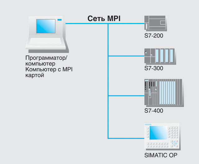Все центральные процессоры CPU 22x могут подключаться через встроенный интерфейс к сети MPI и обмениваться данными с программируемыми контроллерами SIMATIC S7-300/S7-400. Скорость передачи данных может составлять 19.2 или 187.5 Кбит/с. В сети MPI контроллеры S7-200 способны выполнять только функции пассивных устройств и не могут обмениваться данными между собой.