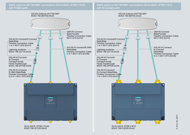 SCALANCE W788-1 RJ45 access points with MIMO antenna and SCALANCE W788-1 M12 with N-Connect connection