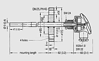 Фланцевый термометр сопротивления с меньшим временем перехода с соединительной головкой, размеры в мм (дюймах)