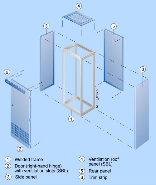The cubicles with ventilation possess a perforated roof panel and doors with standard 5-row ventilation slots to guarantee natural convection. Specifications of the standard ventilation cross-sections are given under "Cubicle Modifications". The ventilation cross-section can be increased easily, where necessary. If the possible increase is still not sufficient, we offer a comprehensive range of forced-ventilation options as described in the section "Cubicle Air-Conditioning."