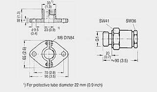 Упорный фланец по DIN 43734 (слева) и резьбовая муфта (справа) для монтажа прямых термопар, размеры в мм (дюймах)