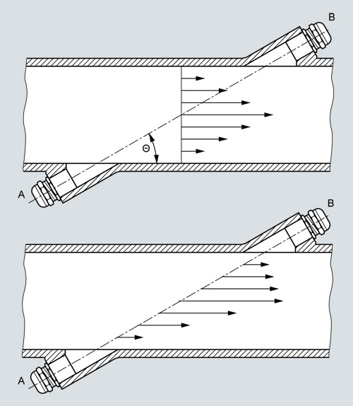 В расходомерах SITRANS F US SONOFLO оба ультрозвуковых акустических преобразователя располагаются под услом по отношению к оси трубы.Акустические преобразователи работают как измерительные преобразователи и приёмники ультразвуковых сигналов. Для измерения определяется время, которое ультразвуковой сигнал затрачивает при перемещении по и против потока. Принцип может быть выражен следующим образом: