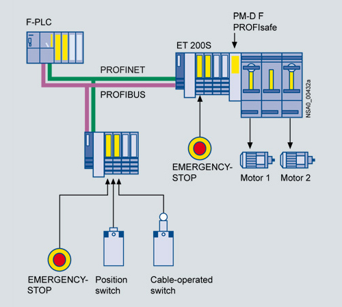 В системах, поддерживающих функции экстренного отключения питания, селективное отключение F-модулей фидеров нагрузки выполняет вышестоящий модуль контроля питания PM-D F PROFIsafe. Для каждого F-модуля фидера нагрузки может быть сформировано 6 групп отключения. Интерфейс связи с датчиками F-системы образуют F-контроллеры SIMATIC. Интерфейс между PROFIsafe и установками с системами безопасности поддерживается через модуль умножителя контактов F-CM с четырьмя выходными контактами.