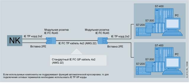 IE TP корд может быть использован с IE FC RJ45 модульной розеткой со вкладышем 2FE (10/100 Mбит/сек)