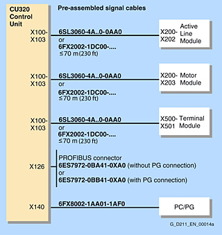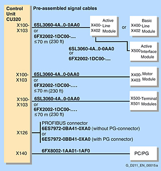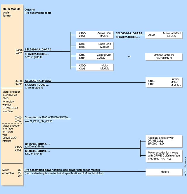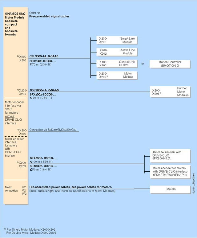 Кабели DRIVE CLiQтипа 6SL3060 4A 0 0AA0, необходимые для стандартной конфигурации, входят в объем поставки сетевых модулей и модулей двигателя. В этом случае модули необходимо устанавливать непосредственно рядом друг с другом в одну линию.