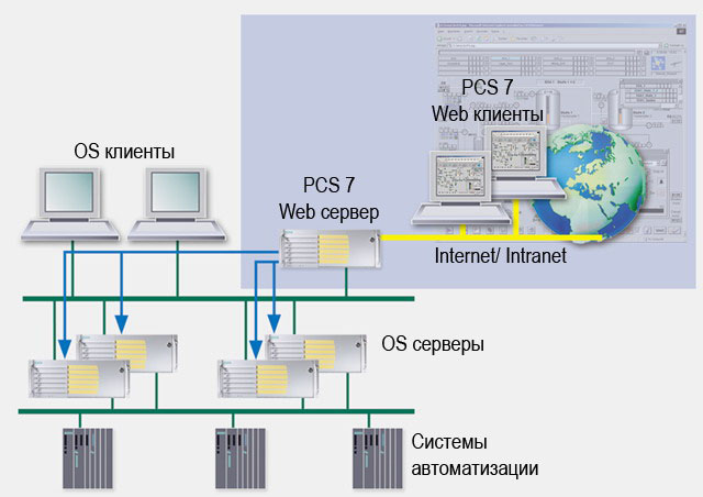 PCS7 Web Server позволяет выполнять дистанционное управление и мониторинг хода протекания производственного процесса через Internet/ Intranet. Для доступа к данным OS серверов PCS7 Web Server использует механизм мульти клиента, предоставляя данные проекта для доступа из intranet/Internet.