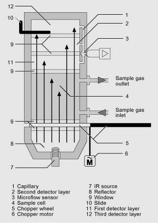 The measuring principle of the ULTRAMAT 23 is based on the molecule-specific absorption of bands of infrared radiation, which in turn is based on the "single-beam procedure". An IR source (7) operating at 600 C emits infrared radiation, which is then modulated by a chopper (5) at 8 1/3 Hz.