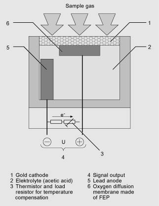 The oxygen sensor operates according to the principle of a fuel cell. The oxygen is converted at the boundary layer between the cathode and electrolyte. An electron emission current flows between the lead anode and cathode and via a resistor, where a measured voltage is present. This measured voltage is proportional to the concentration of oxygen in the sample gas.