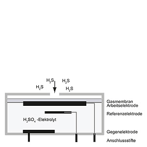 The hydrogen sulfide enters through the diffusion barrier (gas diaphragm) into the sensor and is oxidized at the working electrode. A reaction in the form of a reduction of atmospheric oxygen takes place on the counter electrode. The transfer of electrons can be tapped on the connector pins as a current which is directly proportional to the gas concentration.