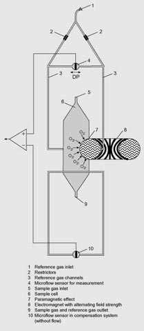 In the case of OXYMAT 6, one gas (1) is a reference gas (N2, O2 or air), the other is the sample gas (5). The reference gas is introduced into the sample chamber (6) through two channels (3). One of these reference gas streams meets the sample gas within the area of a magnetic field (7). Because the two channels are connected, the pressure, which is proportional to the oxygen content, causes a cross flow. This flow is converted into an electric signal by a microflow sensor (4).