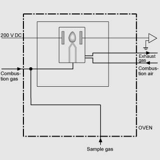 In the detector, the hydrocarbons in the sample gas are burned in an oxyhydrogen gas flame. Burning partially ionizes the proportion of organically-bound hydrocarbons. The released ions are converted into an ionic current by the voltage present between two electrodes, and measured using a highly sensitive amplifier. The current measured is proportional to the quantity of organically-bound C atoms in the sample gas.