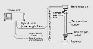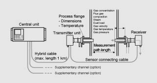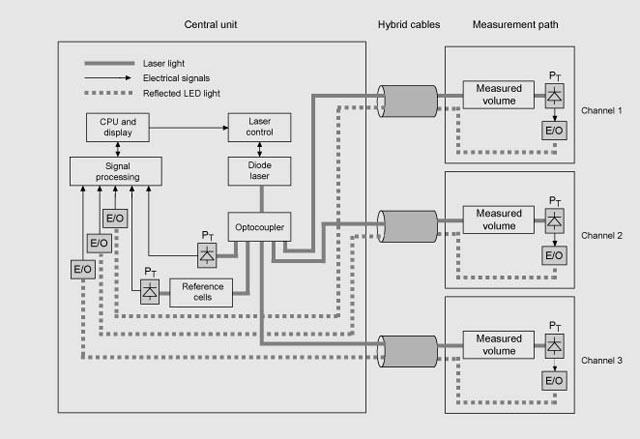 LDS 6 is connected to the measuring points by fiber optics. The laser light is guided by a single-mode fiber from the central unit to the transmitter unit of the in-situ sensor. The sensor consists of a transmitter and a receiver; the distance between them defines the measurement path. In the receiver box, the light is focused onto a suitable detector. The detector signal is then converted into an optical signal and transmitted via a second optical fiber to the central unit, where the concentration of the gas component is determined from the detected absorption signal.