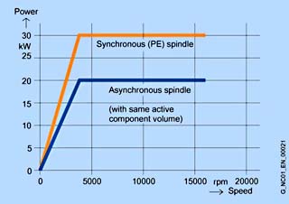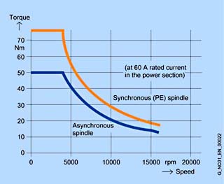 Характеристики мощность-скорость и крутящий момент-скорость шпинделей PE были сравнены с асинхронной версией при следующих граничных условиях: идентичный объем активных частей и одинаковый номинальный ток (60 A) силовой части.