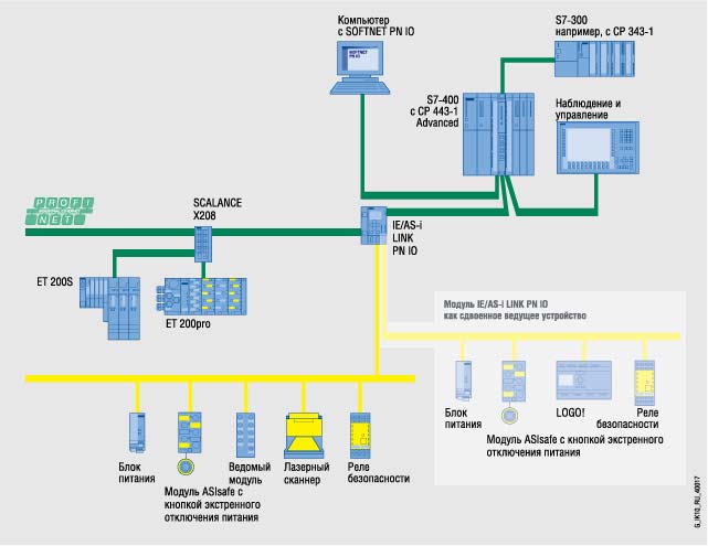 Контроллер ввода-вывода PROFINET IO способен выполнять циклический обмен данными ввода-вывода с AS-Interface. Контроллер ввода-вывода, поддерживающий службы асинхронного обмена данными, позволяет дополнительно использовать вызовы ведущего устройства AS-Interface. Таким образом, модуль IE/AS-i LINK PN IO является идеальным решением для построения систем распределенного ввода-вывода, в которых AS-Interface выступает в качестве подсети сети PROFINET IO.