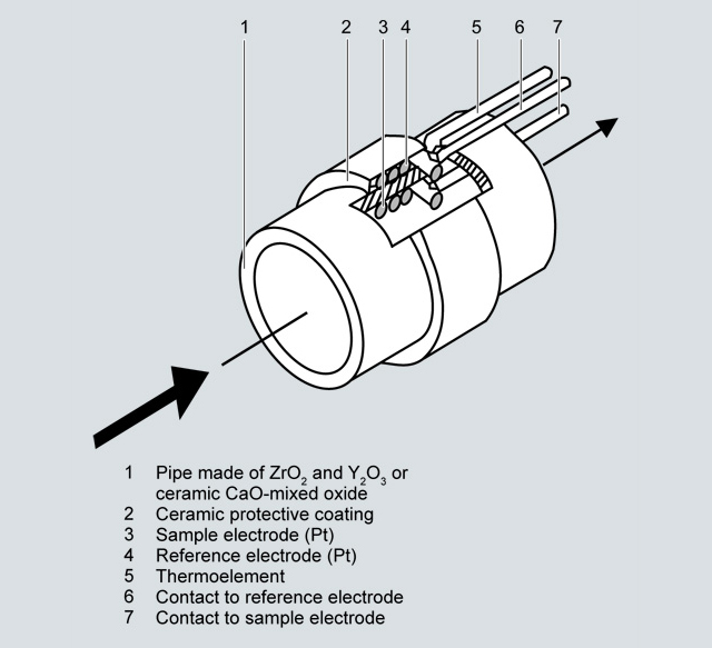 The measuring cell consists of a cylindrical (pipe-shaped) ZrO2 membrane. The sample gas (low O2 content) flows at a constant rate through the inside of the membrane, which is regulated at 650 °C. The exterior of the sensor is exposed to the ambient air (approx. 21 % O2).
