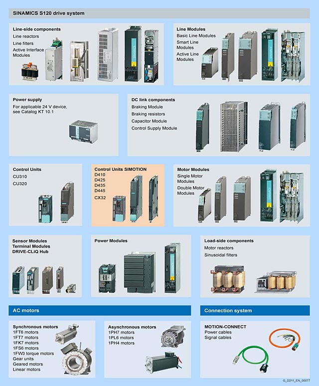 SINAMICS S120 разработан для поддержки комбинации питания и контроля производительности. Многоосные двигатели с высоким уровнем контроля движений могут быть реализованы с использованием модульной системы SINAMICS S120 так же просто, как и решения с использованием одного двигателя.