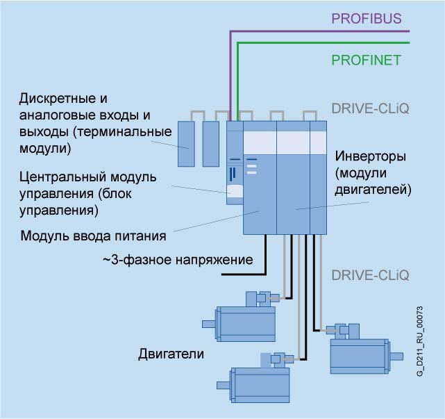 Многоосная структура, также называемая общая DC-шина, отличается повышенной степенью модульности и поддерживает режимы питания линейных модулей и модулей двигателя – оба доступна в блоковом формате и в формате шасси. Линейные модули являются центральными источниками энергии для DC-канала источника напряжения. Линейные модули также доступны с регулированной обратной связью/функцией восстановления для обеспечения постоянного напряжения по каналу пост. тока. Модули двигателя (элементы пост./перем. тока) обеспечивают питание двигателя по каналу пост. тока. Все интеллектуальные функции привода структурированы в блоки управления. Блоки управления обеспечивают возможность выполнения всех функций контроля по обратной связи для группировки приводов. Они также обрабатывают все остальные функции приводов, такие как взаимодействие систем ввода-вывода, управляемых приводом, позиционирование и т.д. и используют PROFIBUS DP или PROFINET центрального интерфейса для связывания с системами автоматизации более высокого уровня.