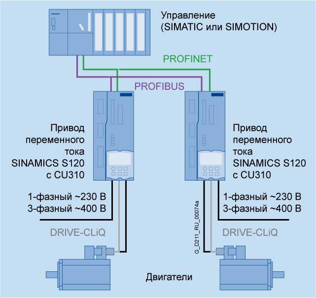 PROFIBUS DP, стандартная шина системы TIA поддерживается во всех вариантах SINAMICS S120, Обеспечивает высокопроизводительную сеть, функционирующую на всех уровнях системы, связывающую все компоненты автоматизации: HMI, элементы управления, приводы и устройства ввода-вывода.