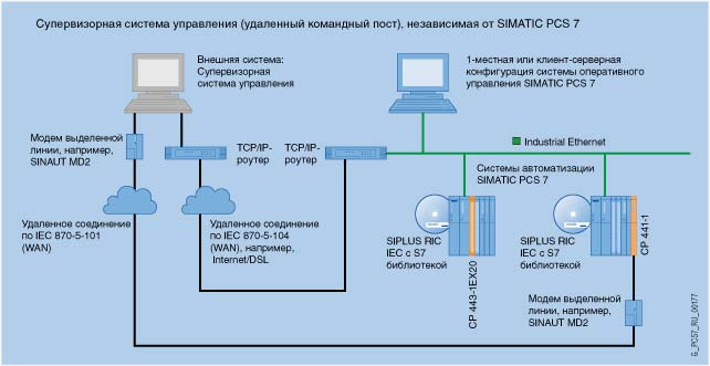 В случае, если система SIMATIC PCS 7 имеет коммуникацию с удаленным центром управления или сторонней системой, используя стандарт IEC 870 5 удаленного управления, IEC 870 5 101 (последовательный) и IEC 870 5 104 (TCP/IP) протоколы удаленного управления могут быть выполнены в системе SIMATIC PCS 7.