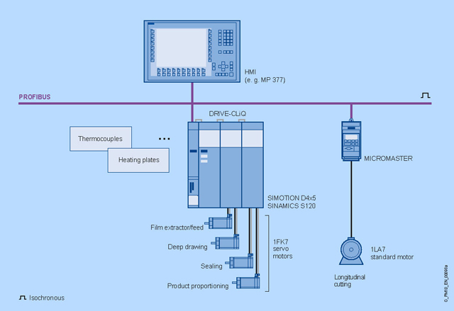 Выбирается базирующаяся на приводе версия SIMOTION D. Таким образом, логика управления, Motion Control, функциональность привода, функции обслуживания и наблюдения объединены в единственном устройстве и системе программирования. Технологические функции - регулирование температуры и кулачковые переключатели имеются в распоряжении как программные блоки.