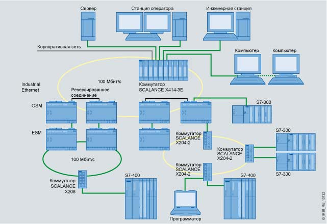 - Иерархические кольцевые резервированные структуры. Отдельные кольцевые сети (10 или 100Мбит/с) подключаются через два модуля ESM к кольцу верхнего уровня со скоростью передачи 100Мбит/с.