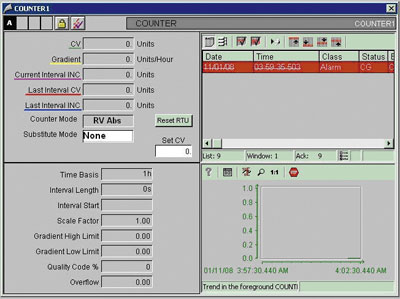 Лицевая панель PCS 7 TeleControlдля одного счетчика (расширенный дисплей из 4 разделенных окон: непреравное и значение на интервале, сводка тревог, настройки параметров, экран трендов)