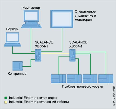 Использование коммутаторов SCALANCE XB004-1 для построения оптической линейной и звездообразных электрических структур