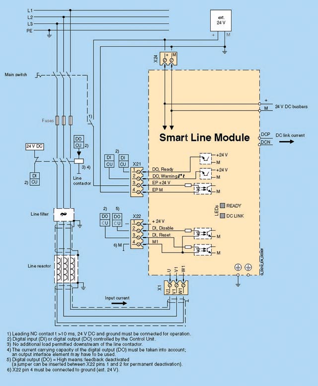 Connection example of 5 kW (5 HP) and 10 kW (10 HP) Smart Line Modules in booksize format