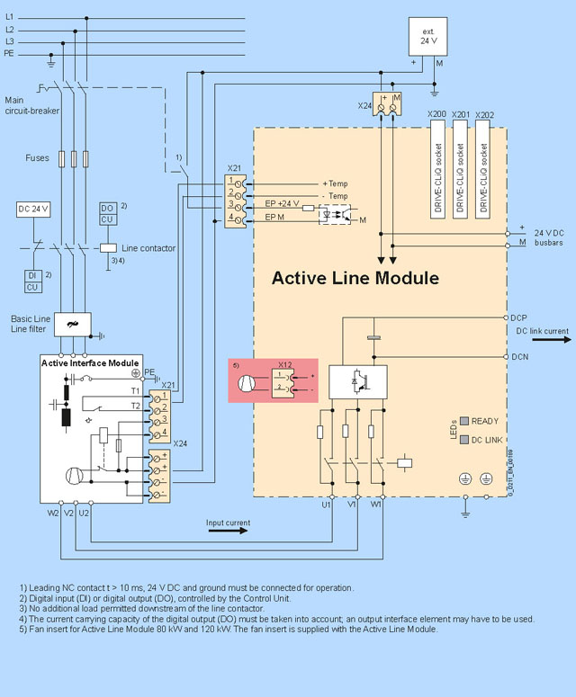 Активный модуль питания связывается по DRIVE CLiQ с управляющим модулем CU320.