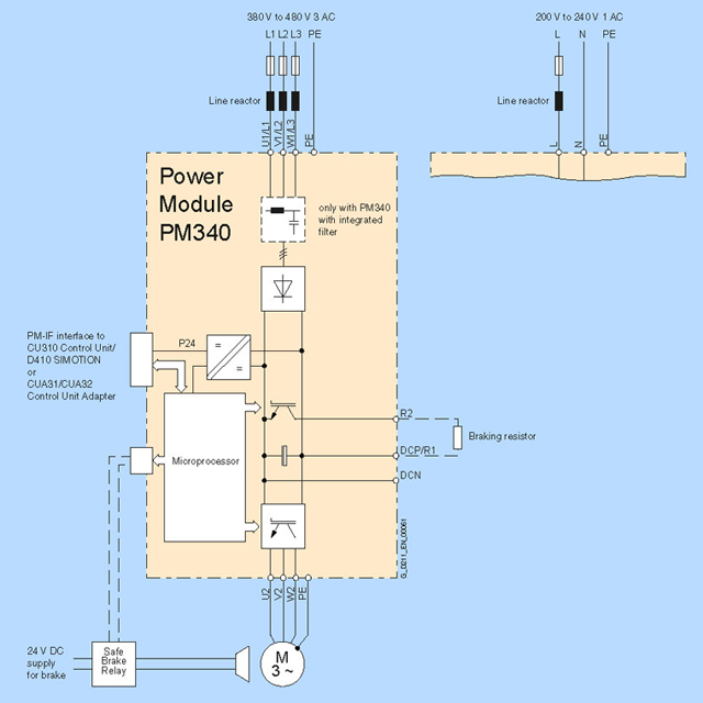 Силовые модули PM340 блочного формата подключаются через интерфейс PM IF с управляющим модулем CU310 DP или адаптером управляющего модуля CUA31.
