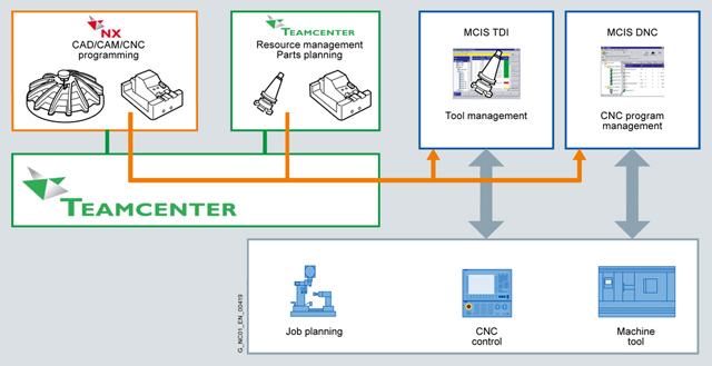 MCIS DNC расширяет стандартную функционального DNC через интеграцию в Teamcenter. Эта связь предлагает непрерывный менеджмент, контроль и защиту для параметров производства, связывая станки с ЧПУ напрямую с информацией производственного планирования. Благодаря прямой передачи программ ЧПУ на станок можно значительно сократить расходы на управление данными ЧПУ. Происходит безопасное управление данными и не допускаются затратные потери данных.