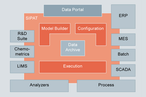 SIMATIC SIPAT от Siemens является соответствующей программной платформой для интеграции PAT в перерабатывающую промышленность. PAT может быть интегрирована в новую или уже существующую инфраструктуру. Это может быть SCADA/Система управления технологическим процессом (опционально с batch процессами), системы управления производством (MES), планирование и управление ресурсами предприятия (ERP), лабораторная информационная система(LIMS), порталы данных, базы знаний, и т.д.. Соединение с системой управления процессом SIMATIC PCS7 через OPC.