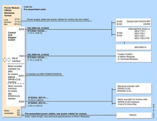 Обзор подключений силовых модулей SINAMICS S120 Power Modules блокового формата с блоком управления CU310 DP и SINUMERIK 840D sl для двигателей с DRIVE-CLiQ интерфейсом
