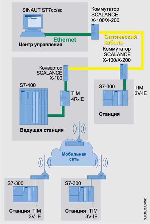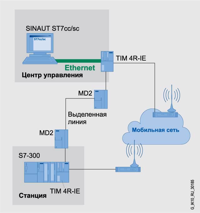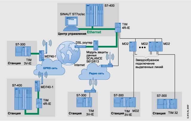 Модуль TIM 4R-IE может устанавливаться в центре управления и работать в комбинации с другими модулями TIM. В приведенном примере модуль TIM 4R-IE подключается к компьютеру центра управления (например, ST7cc) через один из встроенных интерфейсов Ethernet. К этому же интерфейсу модуля TIM 4R-IE подключен контроллер S7-400, который поддерживает связь с другими SINAUT станциями. Другие SINAUT станции подключаются ко второму интерфейсу Ethernet модуля TIM через беспроводные сети, а также к двум интерфейсам RS232/RS485 через выделенные линии. Последовательные интерфейсы модуля TIM настроены на работу в режиме интерфейса RS485 для обеспечения возможности построения звездообразной конфигурации выделенных линий. Такое соединение позволяет использовать до 30 модемов выделенных линий SINAUT. Например, для этой цели могут использоваться модемы MD2.