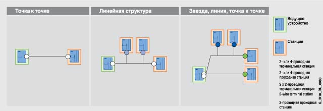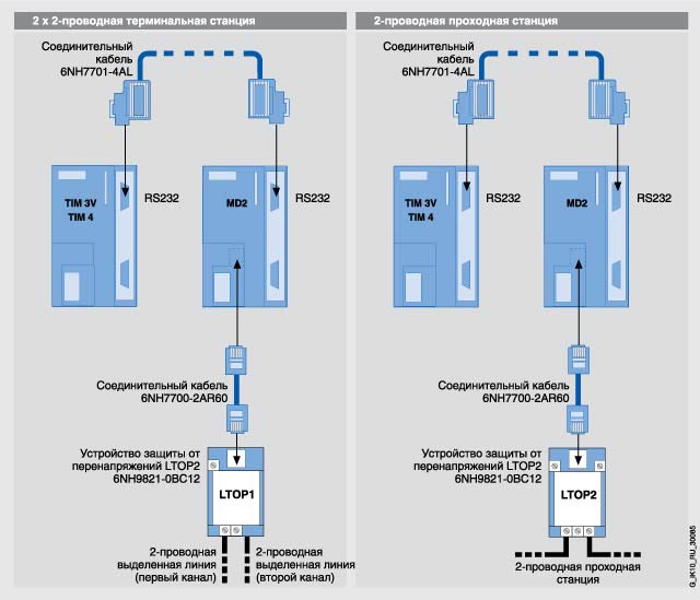 Примеры возможных вариантов соединений с использованием стандартных компонентов приведены ниже (соединительный кабель 6NH7 700-2AR60). Каждый модем MD2 может быть сконфигурирован как терминальное устройство 2-, 2х2- или 4-проводной выделенной линии (примеры конфигурирования терминальных и промежуточных подключений приведены выше).