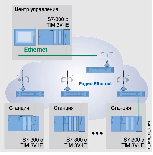 В этом случае функции станции управления выполняет контроллер S7-300 с модулем TIM 3V-IE. Если в радио сети используются процедуры обмена данными с разделением по времени, то модуль TIM 3V-IE необходимо заменить на модуль TIM 4 с приемником DCF77. Например, на модуль TIM 4VD.