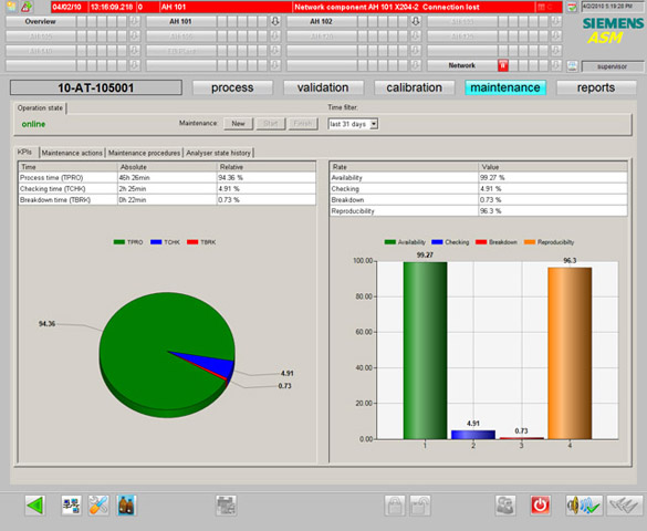 Device-specific maintenance tasks can be specified here, their timing defined, and checked. Documentation such as maintenance procedures or manuals can be opened to support the maintenance work. The view of key performance indicators (KPI) provides a fast overview of the analyzer's performance such as availability, error rate and maintenance frequency |