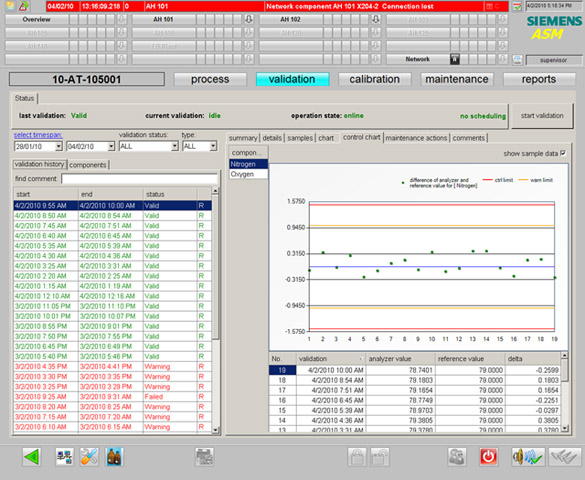 One of the core functions of the ASM is checking the analyzers for reliability of the measured values. Two different methods of measurement are available for recording the values, namely the reference sample method and the line sample method. The resulting values can be checked using different evaluation methods (based on ASTM D3764 or deviation). The objective of the validation is to recognize fluctuations and deviations with respect to a comparison value, and to thus permit a statement to be made on the reliability and drift of the measurement.