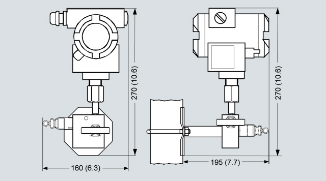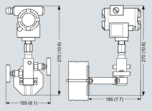 7MF9011-4FA valve manifold with mounted gauge pressure and absolute pressure transmitters, measurements in mm (Inch)