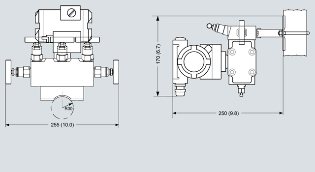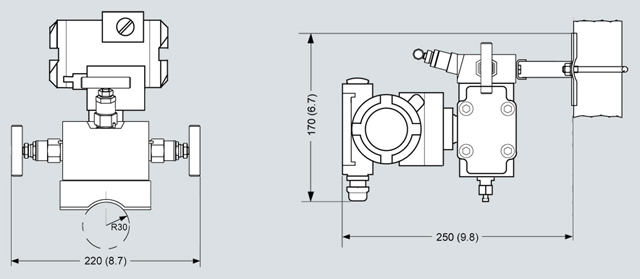 7MF9011-4EA valve manifold with mounted gauge pressure and absolute pressure transmitters, measurements in mm (Inch)