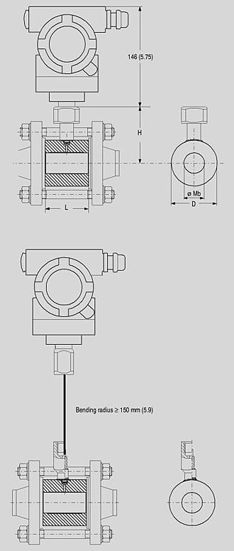 Clamp-on seal for flange-mounting, connected to SITRANS P pressure transmitter, dimensions in mm (inch)