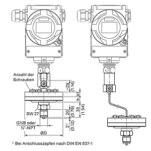 Diaphragm seal, screwed gland with inside diaphragm, for differential pressure, direct and attached directly to the transmitter with with capillaries, measurements in mm (Inch)