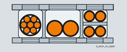 To maximize the service life of the cable carrier and cables, cables in the carrier made from different materials must be separated in the cable carrier by means of spacers. The spacers must be filled evenly to ensure that the position of the cables does not change during operation. The cables should be distributed as symmetrically as possible according to their weights and dimensions. Cables with very different outer diameters should be separated by spacers as well.